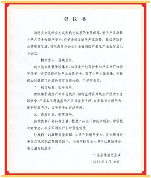 江蘇省消防協(xié)會(huì )向全省消防產(chǎn)品生產(chǎn)企業(yè)發(fā)出“提升消防產(chǎn)品質(zhì)量”倡議