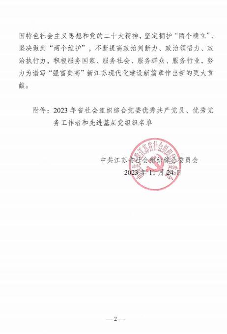 近日,中共江蘇省社會(huì )組織綜合委員會(huì )印發(fā)《關(guān)于表彰優(yōu)秀共產(chǎn)黨員優(yōu)秀黨務(wù)工作者和先進(jìn)基層黨組織的決定》,江蘇省消防協(xié)會(huì )黨支部榮獲“先進(jìn)基層黨組織”稱(chēng)號,協(xié)會(huì )黨支部書(shū)記、會(huì )長(cháng)蔣正林同志被授予“優(yōu)秀黨務(wù)工作者”稱(chēng)號,協(xié)會(huì )秘書(shū)高亞嵐同志被授予“優(yōu)秀共產(chǎn)黨員”稱(chēng)號。