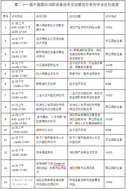備受矚目的第二十一屆中國國際消防設備技術(shù)交流展覽會(huì )將于2025年10月13日至16日在中國國際展覽中心隆重舉行,同期舉辦的系列專(zhuān)業(yè)論壇(詳見(jiàn)下表)將陸續登場(chǎng)。屆時(shí),多領(lǐng)域、多學(xué)科的國內外知名專(zhuān)家學(xué)者、單位領(lǐng)導、業(yè)務(wù)精英以及杰出企業(yè)代表將齊聚一堂,共同分享和探討消防技術(shù)創(chuàng )新的前沿動(dòng)態(tài)、消防產(chǎn)業(yè)的發(fā)展趨勢以及工程化、實(shí)戰化應用的關(guān)鍵策略,共同分析和展望消防應急救援的未來(lái)發(fā)展方向。歡迎社會(huì )各界相關(guān)專(zhuān)業(yè)人士積極參與系列專(zhuān)業(yè)論壇,為學(xué)術(shù)交流活動(dòng)和創(chuàng )新成果轉化應用、推動(dòng)消防事業(yè)的可持續高質(zhì)量發(fā)展貢獻力量。