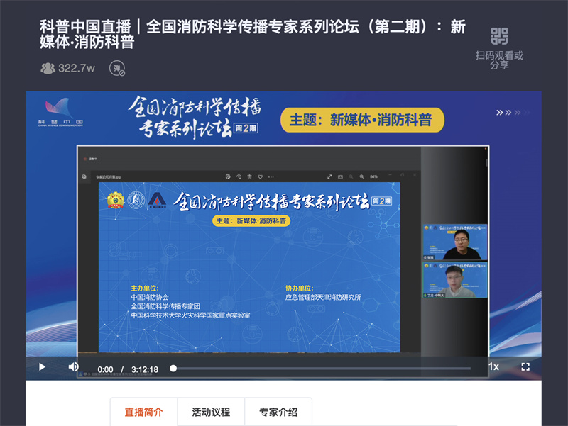 11月27日,由中國消防協(xié)會(huì )聯(lián)合中國科學(xué)技術(shù)大學(xué)火災科學(xué)國家重點(diǎn)實(shí)驗室(以下簡(jiǎn)稱(chēng)“火災實(shí)驗室”)共同主辦、應急管理部天津消防研究所協(xié)辦的“全國消防科學(xué)傳播專(zhuān)家系列論壇第二期——新媒體?消防科普”(以下簡(jiǎn)稱(chēng)“論壇”)成功舉行。來(lái)自消防救援隊伍、科研院所、高校、消防企業(yè)等單位的8位專(zhuān)家學(xué)者出席會(huì )議并作報告。論壇主席為中國消防協(xié)會(huì )科普教育委員會(huì )副主任李進(jìn)、火災實(shí)驗室副主任紀杰教授和應急管理部天津消防研究所科技處處長(cháng)李晉研究員。李進(jìn)及李晉研究員分階段主持會(huì )議。論壇以線(xiàn)上方式進(jìn)行,同時(shí)在光明網(wǎng)、科普中國、抖音、知乎、蔻享學(xué)術(shù)、嗶哩嗶哩等平臺直播。
